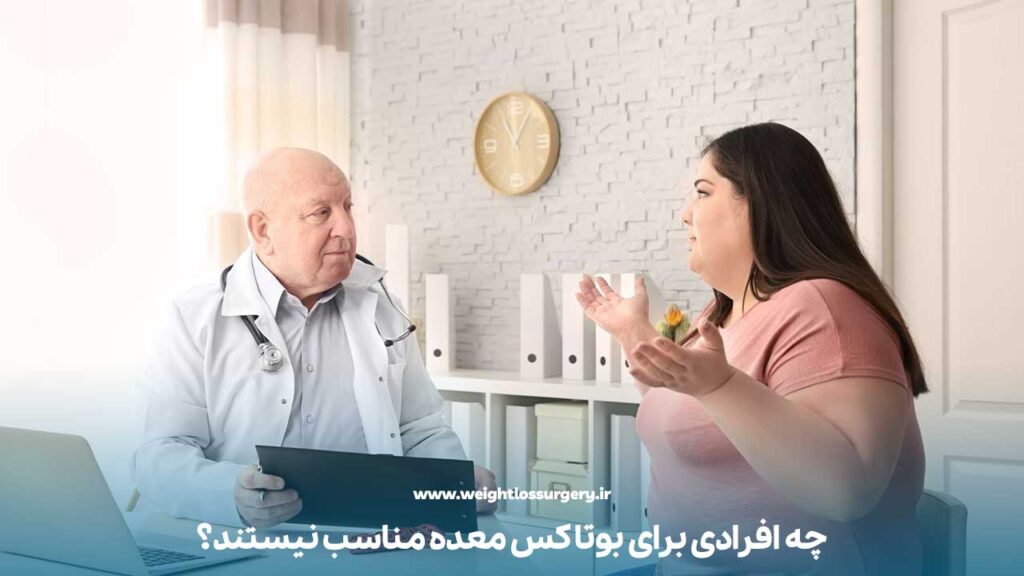بیمارانی که به مبتلا به بیماری های گوارشی از جمله ورم معده و زخم معده هستند باید از انجام این عمل اجتناب کنند. همچنین خانم های باردار و شیرده، بیماران قلبی، کلیوی و کبدی و افرادی که به بوتاکس حساسیت دارند یا مبتلا به بیماری های عضلانی هستند نباید این تزریق را انجام دهند. افراد دارای شاخص توده بدنی 40 به بالا که دارای چاقی مفرط هستند به هیچ عنوان نمی توانند از این عمل لاغری استفاده کنند و تنها راه درمان برای این افراد عمل های خاص چاقی مثل اسلیو معده و بای پس معده می باشد. تزریق بوتاکس معده به طور معمول برای افرادی که تنها ۸ تا ۱۰ کیلوگرم اضافه وزن دارند می تواند یک گزینه ایده آل و موقت قابل برای کاهش وزن مورد استفاده باشد.